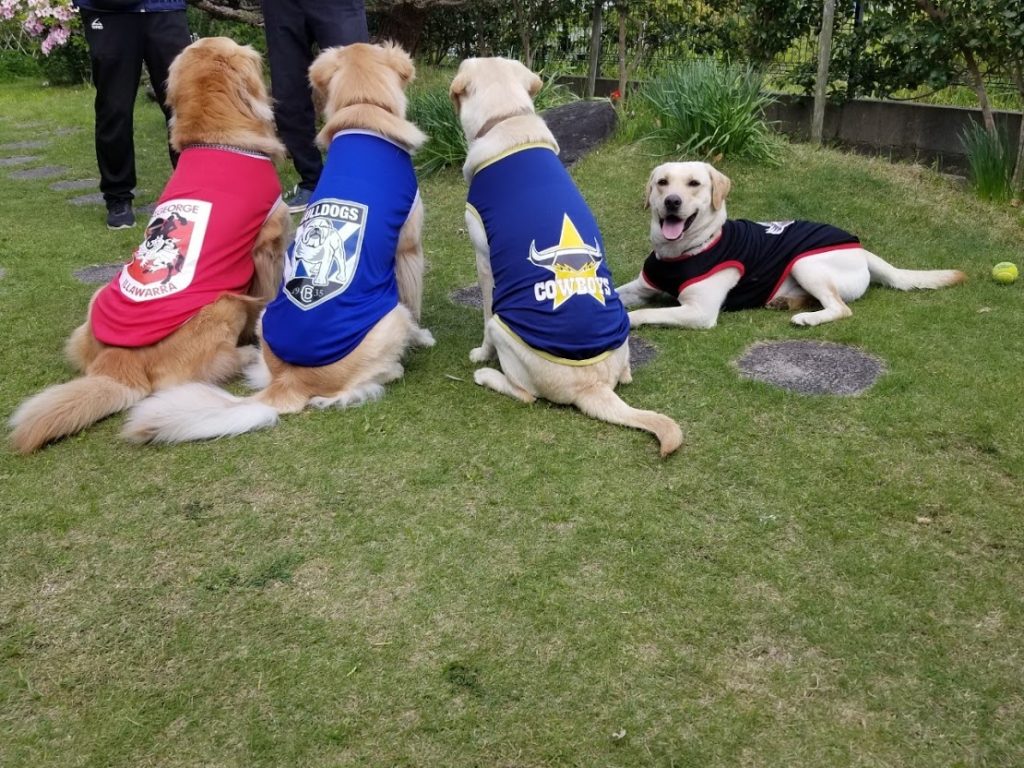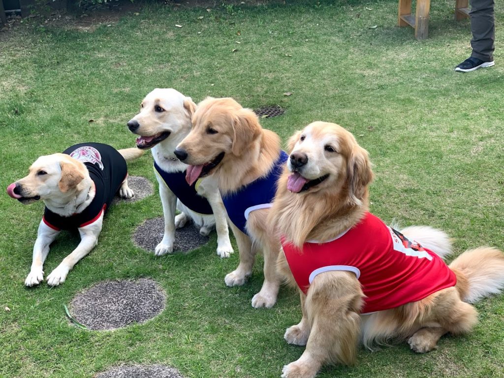 コロナ下で一緒に散歩してるご近所仲良しゴル2匹、ラブ2匹